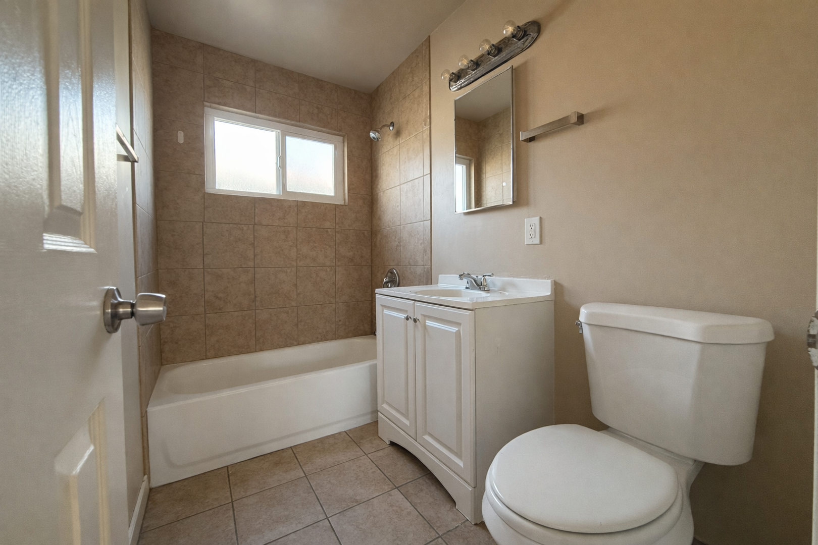 Bathroom with a tub-shower and updated fixtures.