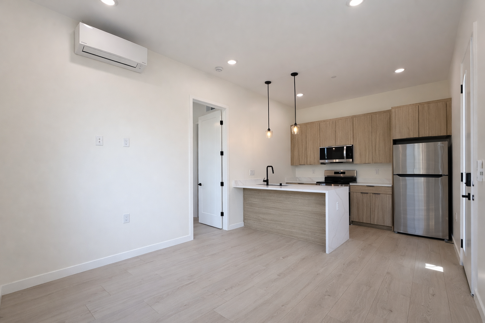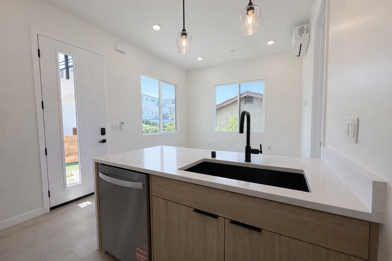 The open-concept layout offers abundant natural light and partial to full views, enhancing the home’s airy and inviting feel. The kitchen is equipped with quartz countertops, custom cabinetry, stainless steel appliances, matte black fixtures, and a functional peninsula perfect for dining or entertaining.