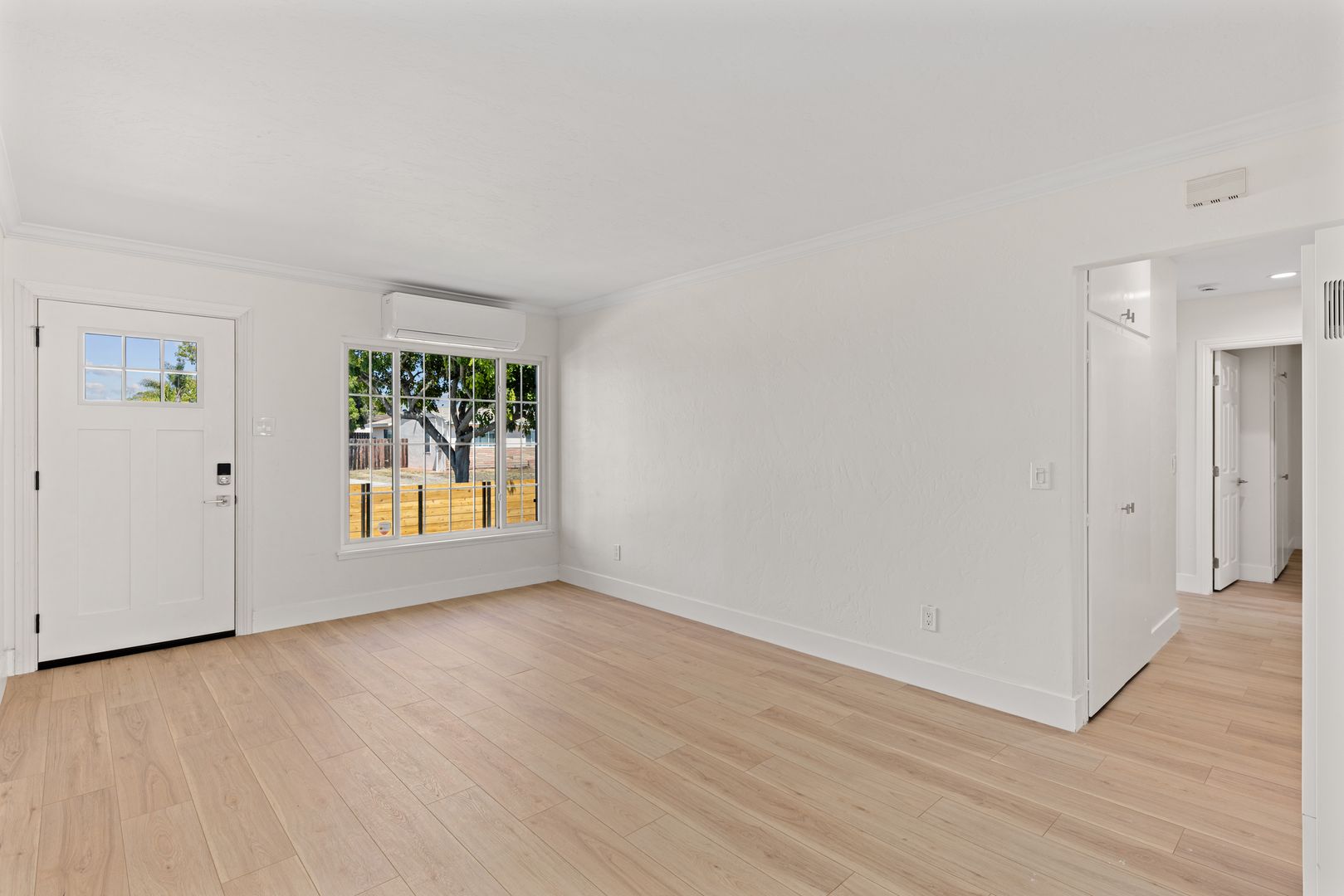 Enjoy modern wood-look vinyl flooring throughout, a spacious front yard, and a private side yard, perfect for outdoor lounging, or entertaining. The home comes equipped with in-unit laundry, mini-split heating and cooling systems, a garage, and driveway parking for added convenience.