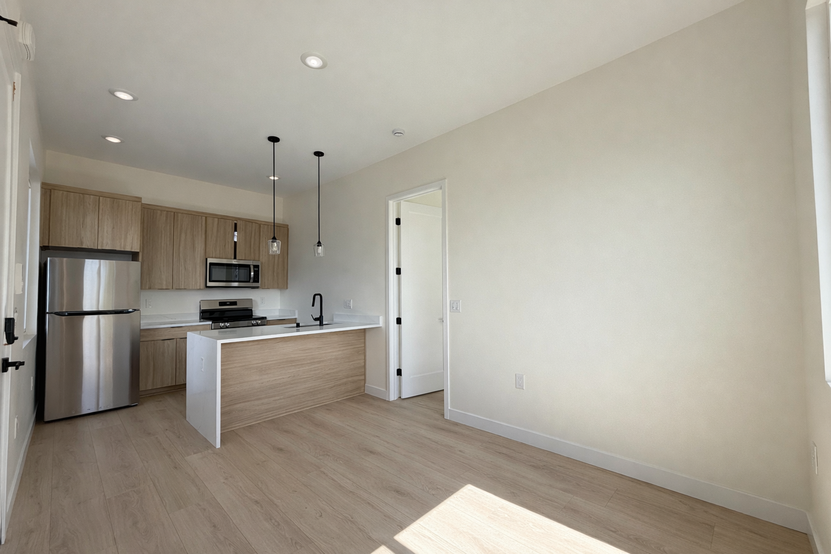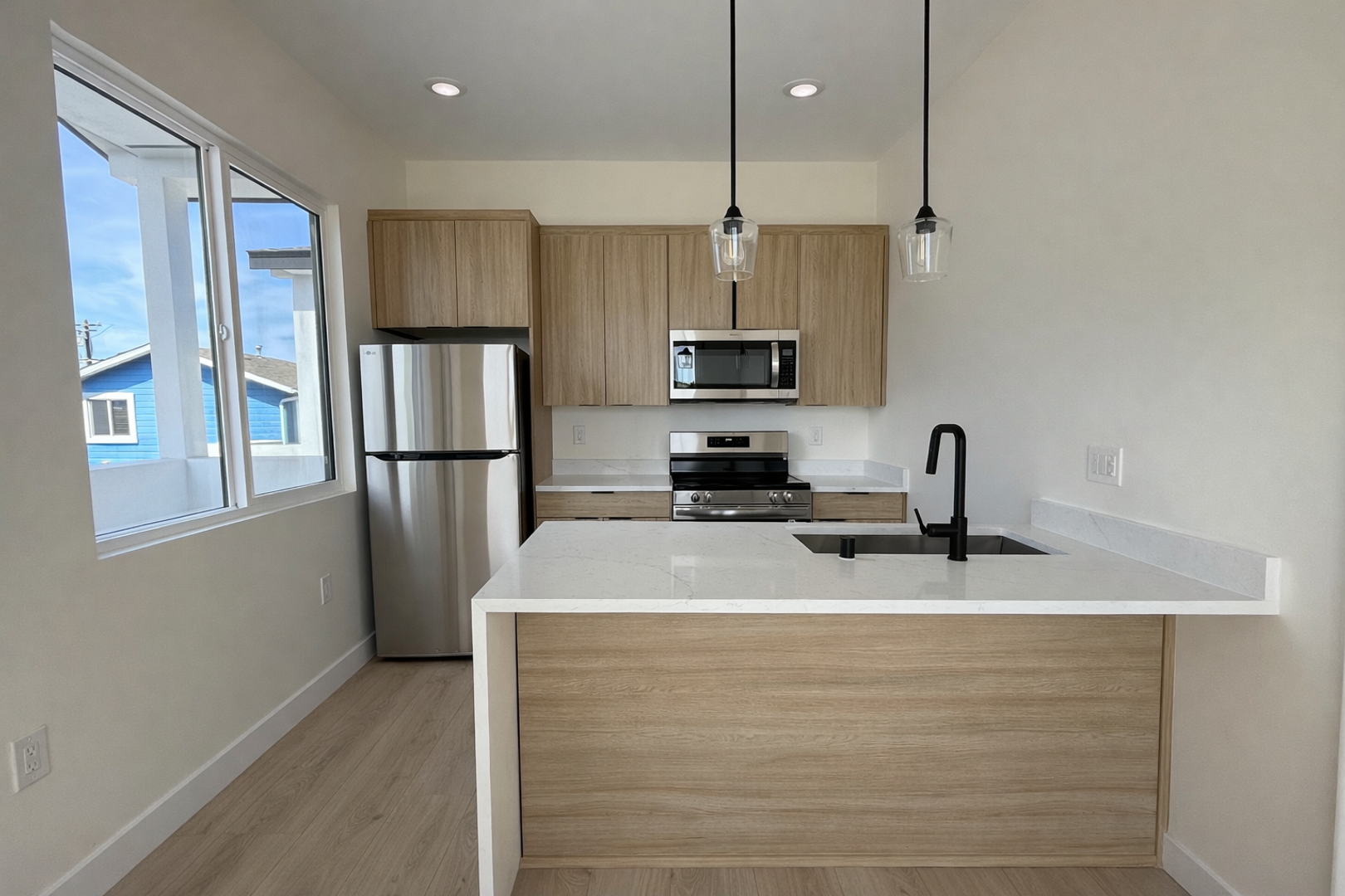 The open-concept kitchen includes quartz countertops, custom cabinetry, stainless steel appliances, matte black fixtures, and a functional peninsula perfect for dining or entertaining.